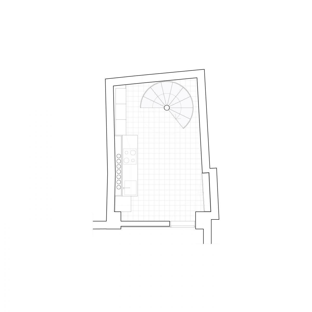 Materialmente, se ha perseguido cierto refinamiento en los nuevos elementos a implementar, en oposición a la cruda expresividad de los muros existentes, conscientes de que el espacio ha de albergar un hogar. Así, la cocina es un mueble de latón esmerilado, brillante y con reflejos, con un sobre de mármol blanco; el equipamiento del baño está panelado con madera lacada de un color ligeramente crema, con detalles en negro y latón; los ‘cabeceros’ de las plantas están revestidos en microcemento blanco; los suelos de mosaico hidráulico, microcemento y roble, añaden calidez y color al interior; y los techos de madera lacada blanca incorporan los registros y las rejillas para ‘diseñar’ estas necesidades.