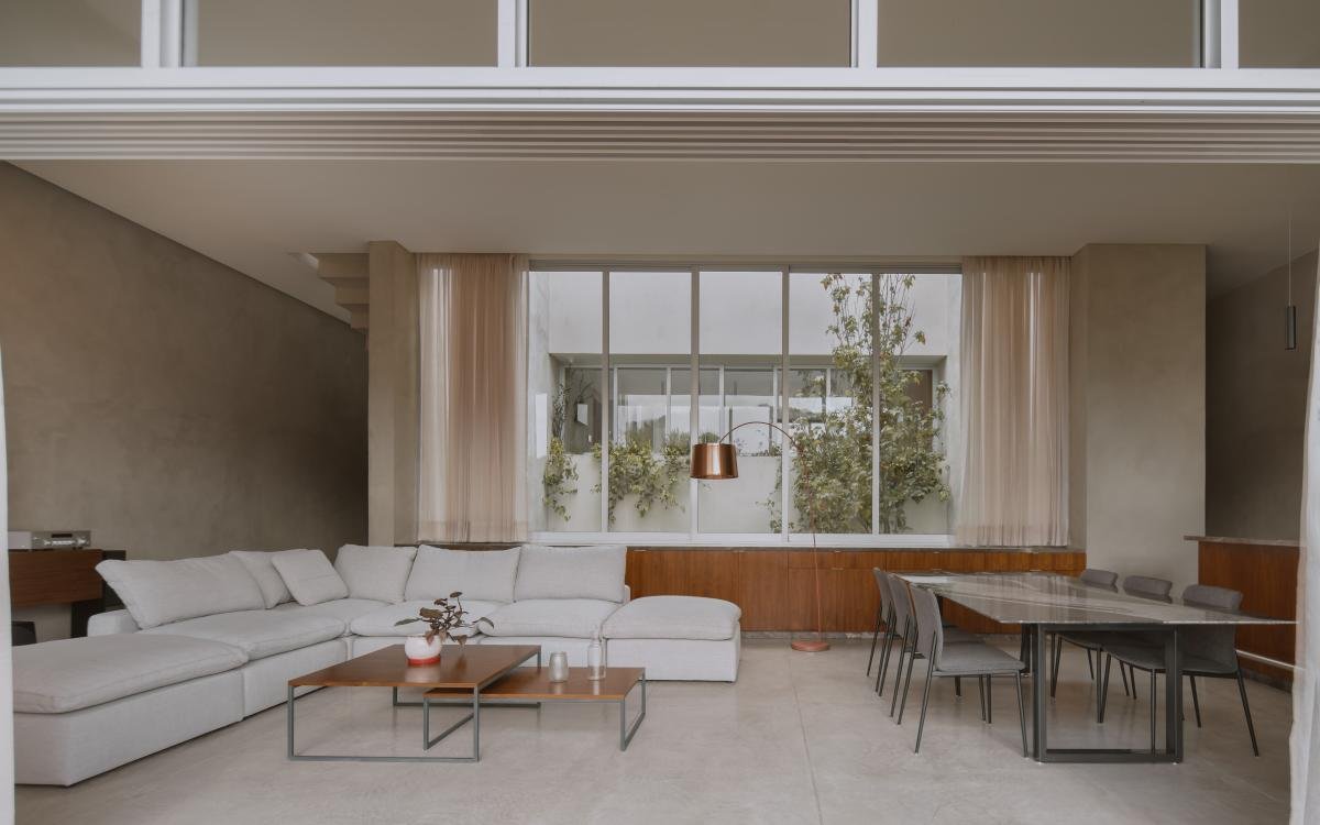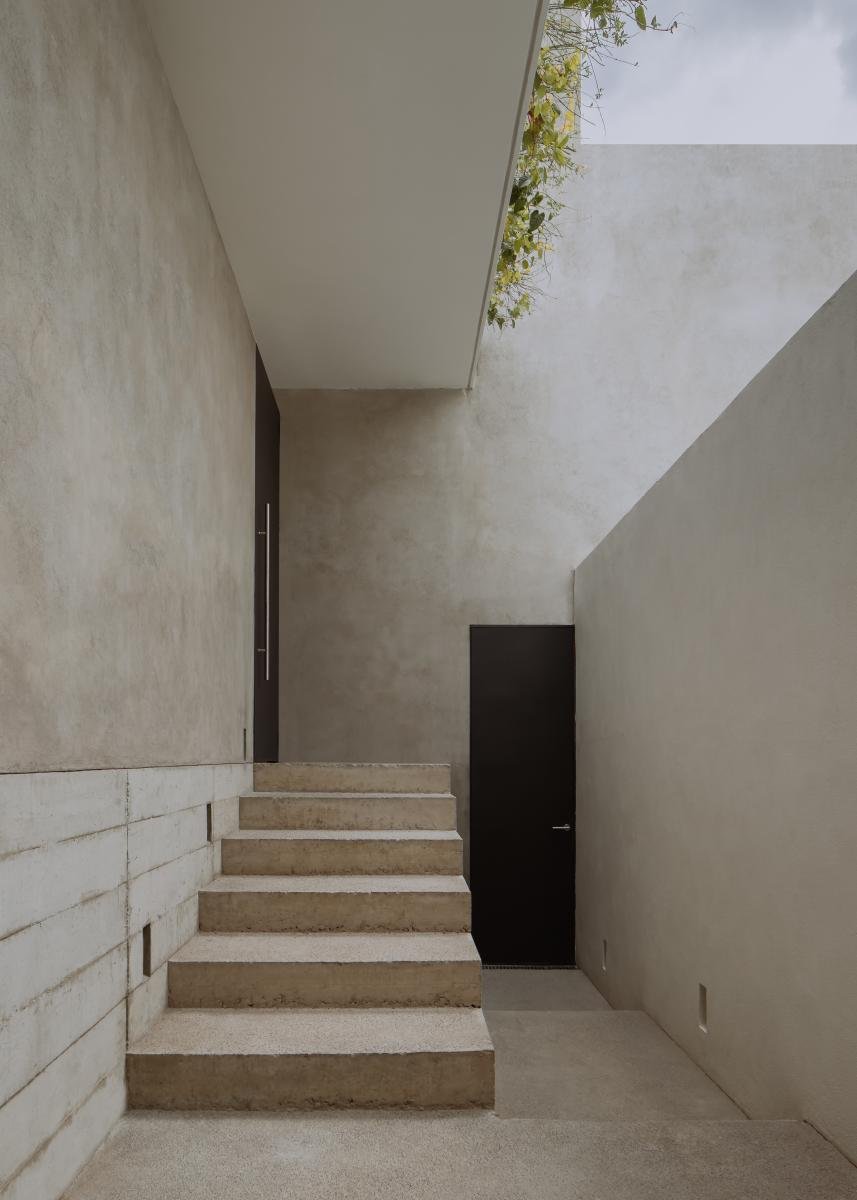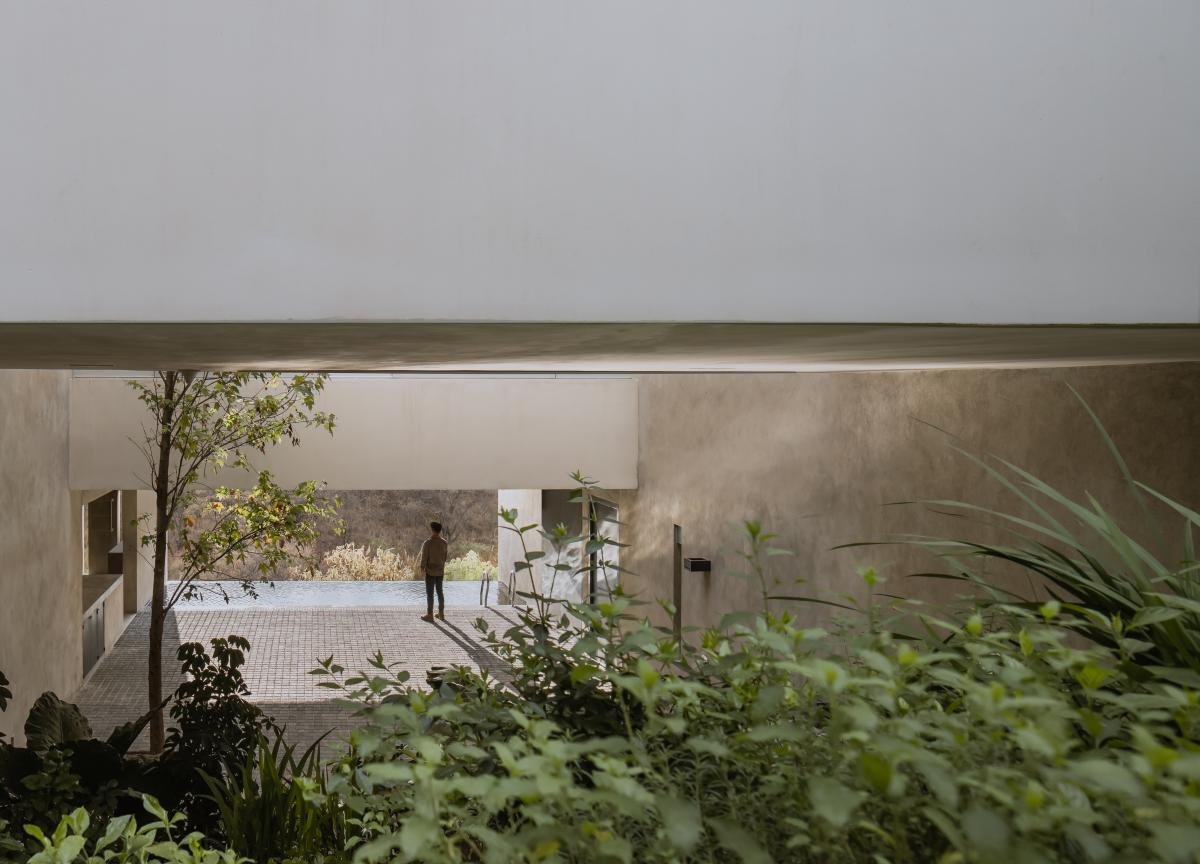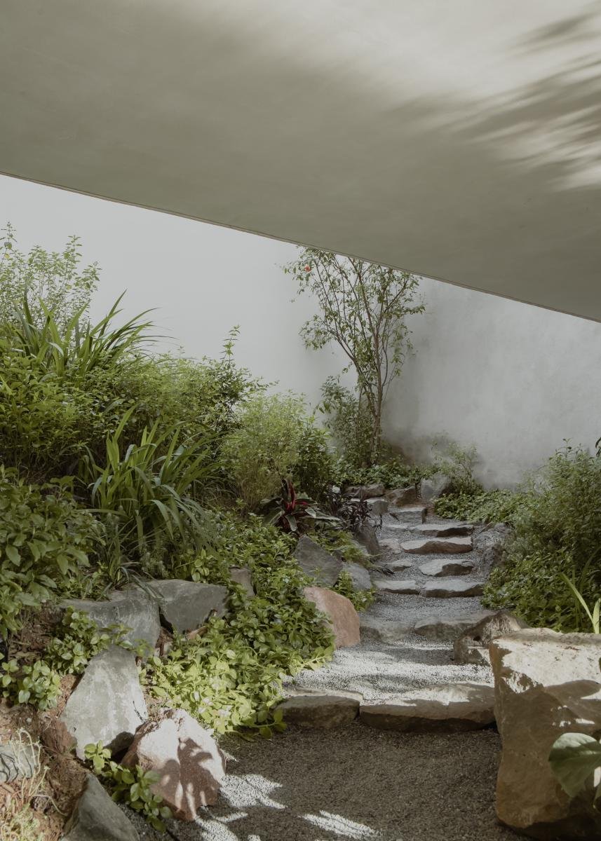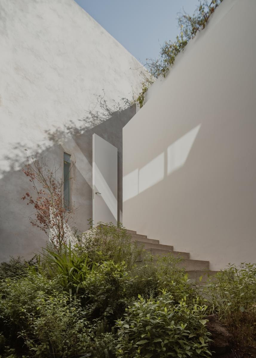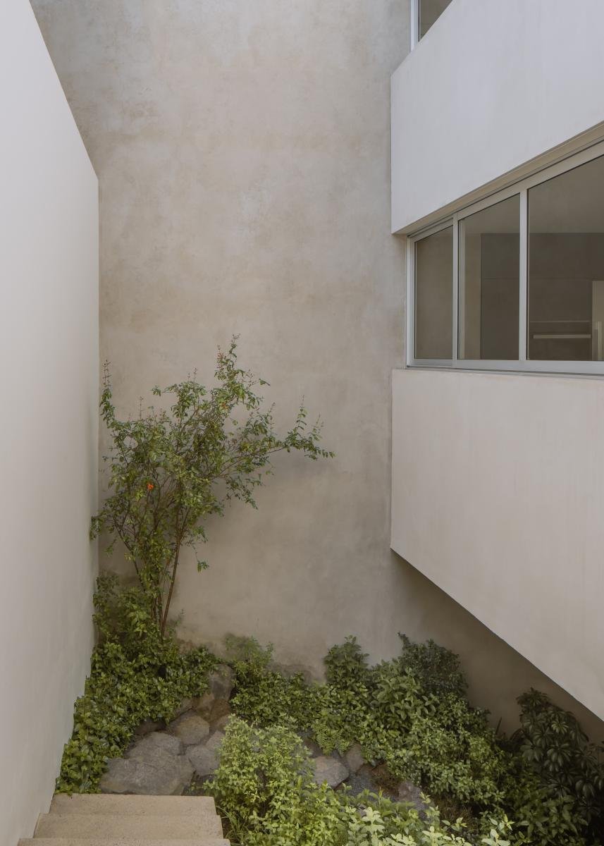 Bajo el nivel de banqueta existe la planta baja con el área pública y la cocina. Un nivel más abajo, en el terreno natural que queda bajo la sala, se hizo un patio central que alberga una cocina al aire libre y una alberca semi cubierta.