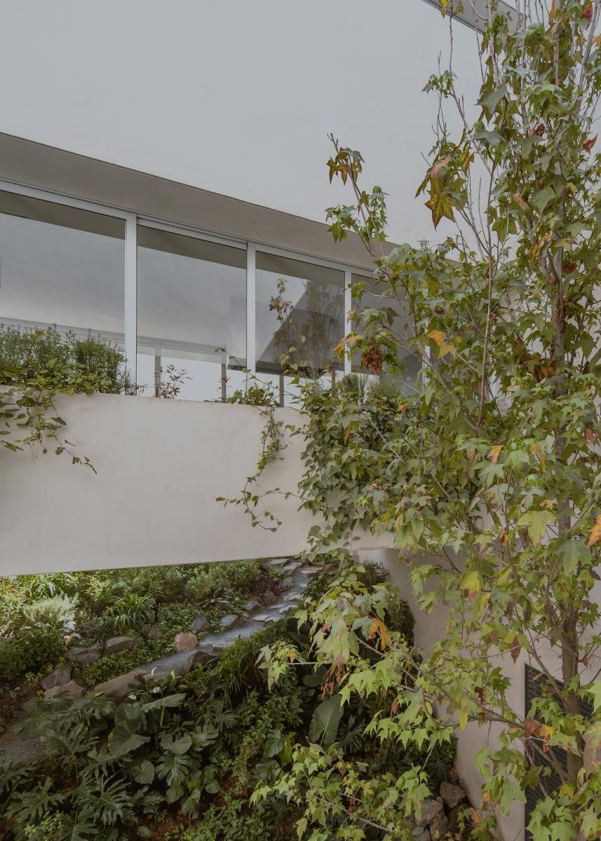El edificio se desplanta en tan solo 100 metros cuadrados a partir de los bloques de servicios y circulaciones que se encuentran a lo largo de los dos lados que colindan con vecinos, estos volúmenes laterales protegen la privacidad del interior de la casa y sirven para empotrar los volúmenes transversales blancos que vuelan por encima del terreno natural, dejando así que la topografía y la vegetación de la cañada pasen por debajo de toda la casa sin obstáculos. Estos volúmenes blancos albergan los espacios principales de la casa y se abren de lado a lado hacia la cañada y los patios interiores.