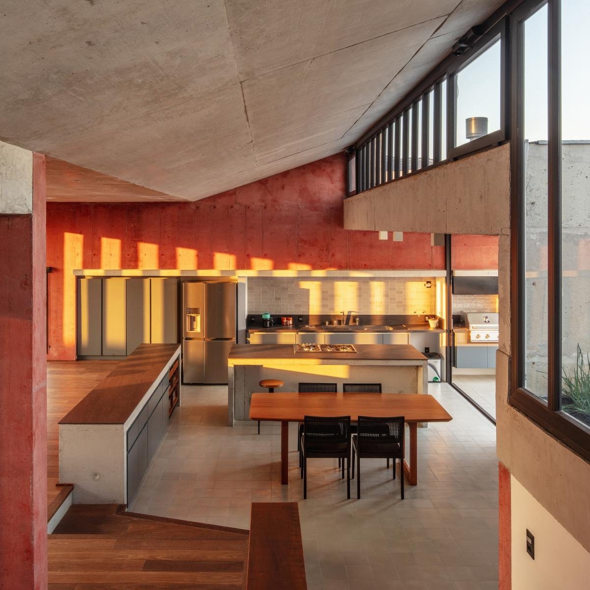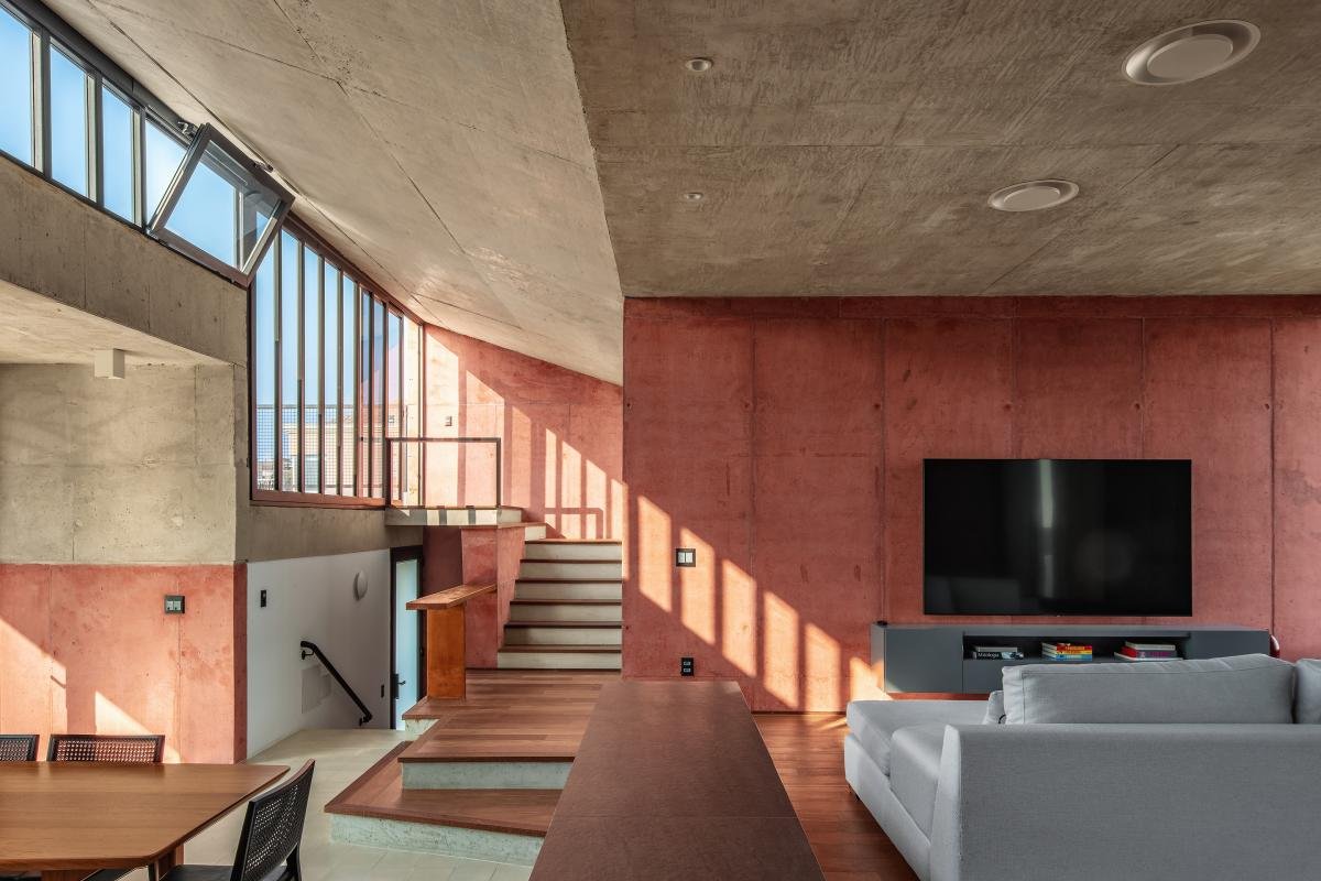 El diseño de la escalera y sus diversos descansos conectan los ambientes y permiten una circulación por la espacialidad de la casa.