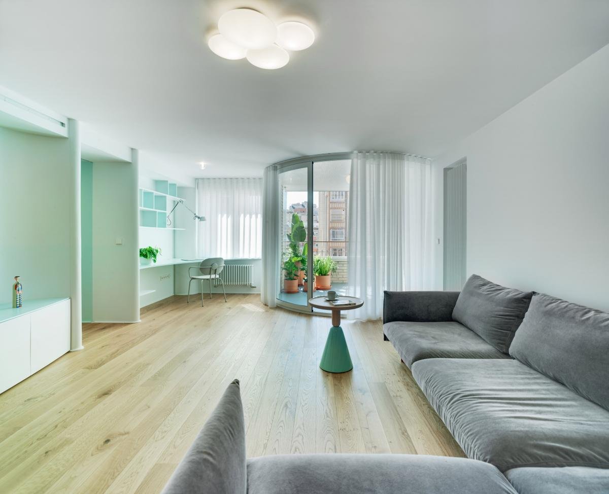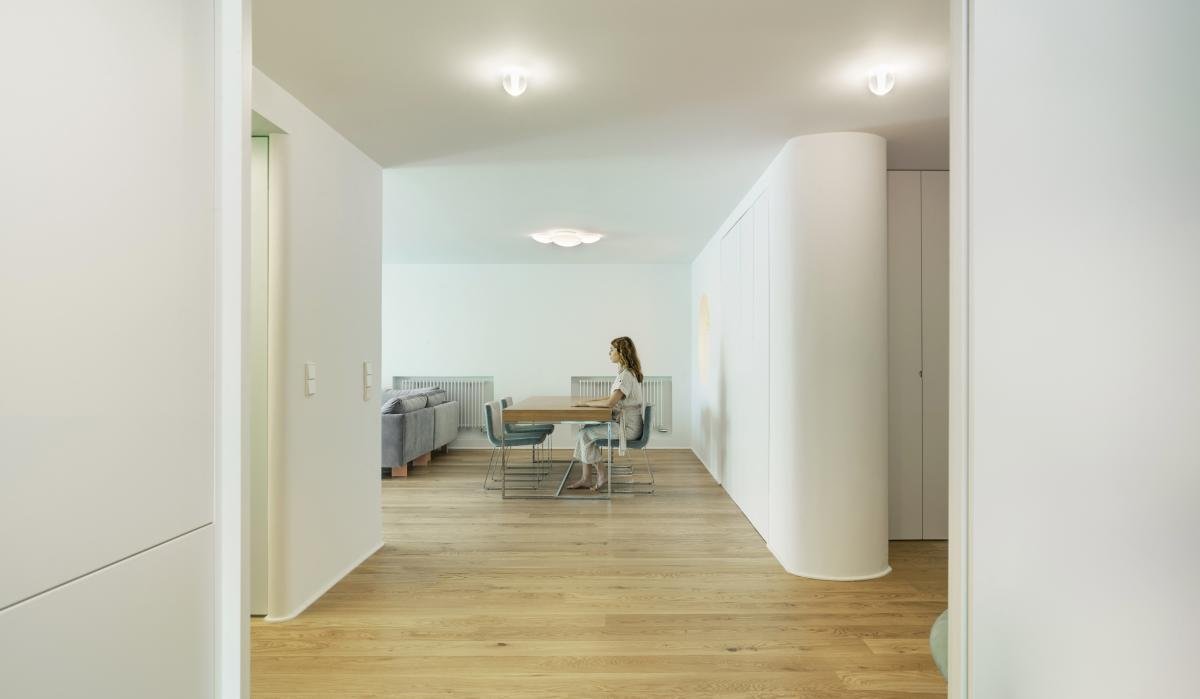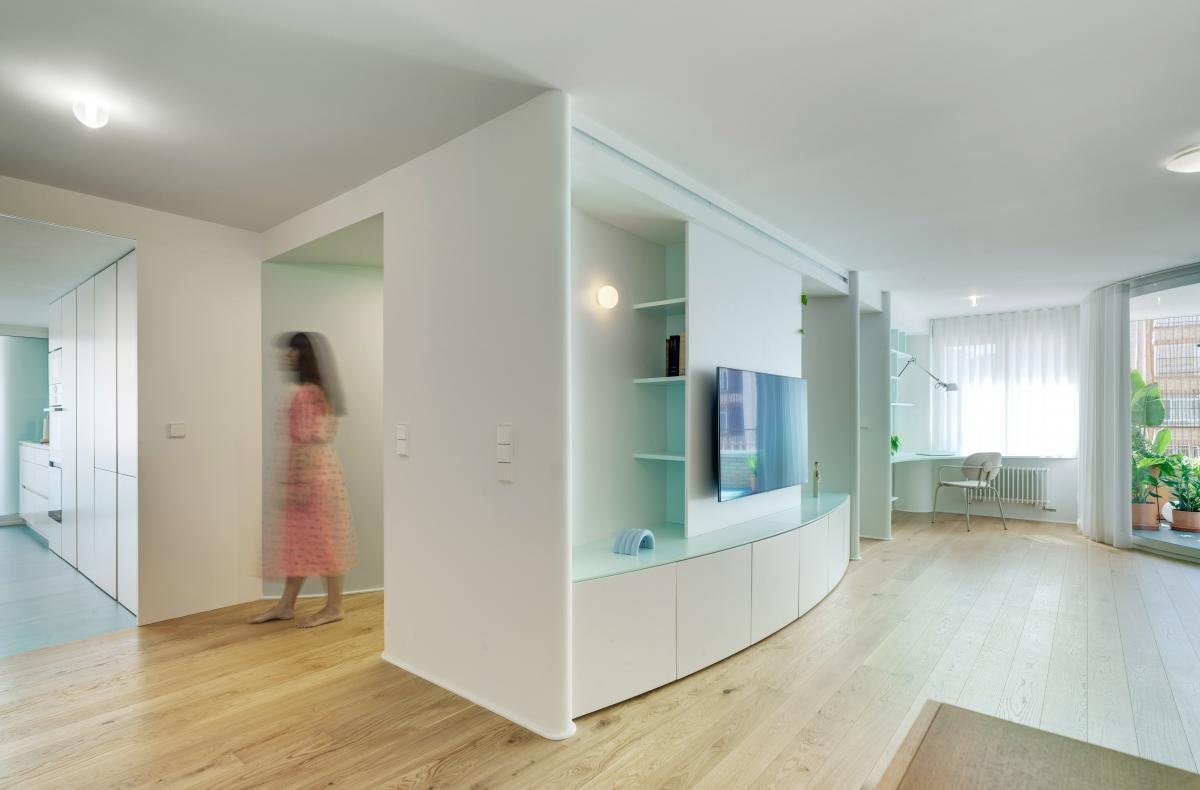 Anulando la entrada “noble” aprovechamos la de servicio para acceder por la mitad de la casa y acortar recorridos. Como una suerte de espiral (o caracola), la casa se organiza en torno a un centro curvo que te desliza hasta las habitaciones. Este recorrido se realiza por un espacio comprimido en tono verde aguamarina que provoca un efecto expansor cuando “sales” a las habitaciones anexas. Imagina que vas buceando por una sima (el paso) y sacas la cabeza en un espacio abierto (las habitaciones), esa es la sensación. Pero no por ello queremos que vayas rápido, el camino también se disfruta.