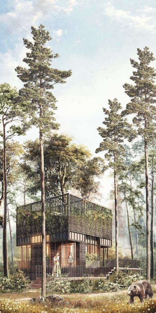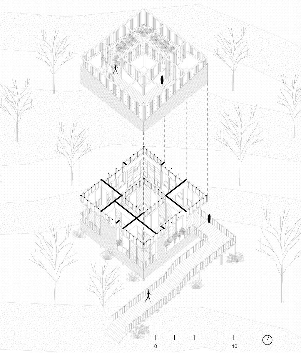 Así es como aparece una estructura metálica elaborada con una modulación general de 2.40m y un submódulo principal de 0.80m que se eleva y enmarcan los pies de los grandes troncos que sostienen el follaje del bosque, transformándolo en el eje principal del proyecto. Buscando mimetizar el entorno mediante un revestimiento de madera oscura elaborada con fajillas de madera sobrepuestas entre sí; creando una serie de estrías que alucinan el crecimiento y envejecimiento paulatino de la vegetación. Coronándose con una cubierta inclinada en sus extremos que aprovechan la captación pluvial a través de un jardín vegetal que asimila un espacio mítico y encantado que busca abrazar con sus enredaderas las grandes ramas que caen de las copas robustas. Al interior, una caja cálida de madera de pino nos envuelve y nos direcciona a remates hechos de cristal que enmarcan el majestuoso paisaje que nos rodea y que incentivan las cambiantes de luz apoderarse de este espacio.