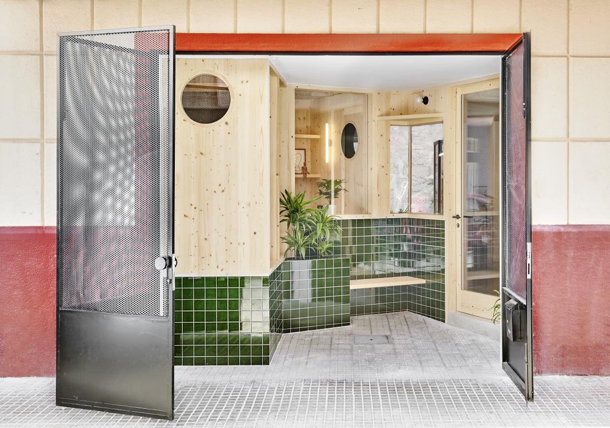 La transición que se generaba entre la calle peatonal y el acceso resultaba muy violenta, por lo que se consideró esencial crear un espacio intermedio que actuara como amortiguador. Este jardín funciona como entrada de luz y ventilación, a la vez que actúa como una barrera acústica y de privacidad sobre el interior. Para poder dotar a éste espacio de la mayor versatilidad posible se disponen varias capas que se pueden combinar mediante un gran numero de variaciones. Una primera fachada de librillo exterior acabada con malla perforada tamiza la luz, ventila y dota de un primer grado de privacidad hacia el interior. Posteriormente, una segunda fachada de vidrio y carpintería de madera, aísla acústicamente el local de la calle peatonal. Un banco de madera y un macetero de baldosa completan el espacio que actua de transición y desahogo.