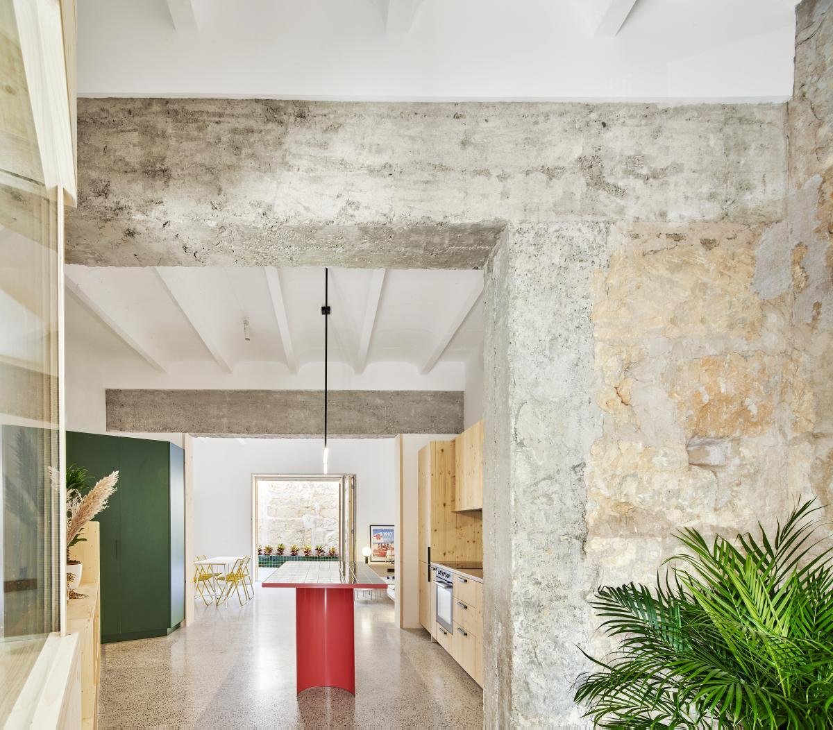 El lado derecho de la partición se reserva a los espacios comunes. Un suelo continuo de hormigón pulido con árido visto recorre el resto de la vivienda para crear mayor sensación de continuidad y amplitud. Una cocina centrada junto con una mesa alta de trabajo se sitúan en el centro del espacio fomentando los encuentros y reuniones. Esta mesa alta esta co-diseña y producida por un estudio joven Mallorquin 2MonosStudio y dota al espacio de un toque de color y frescura a la envolvente más minimalista.