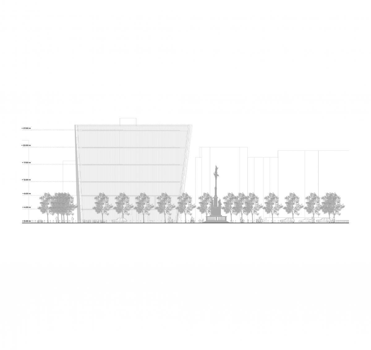 Un elemento que requería ser incorporado al nuevo edificio es la Mariensäule (o columna de María). A partir de ésta, se produce la separación del edificio en dos elementos, generando un eje central que conecta visualmente el Wohnhaus y el Bank Uni-Credit a través de la plaza. La fachada que da hacia el Wohnhaus (o norte) se abre hacia las calles Drahtgasse y Farbergasse, invitando a las personas a ingresar por el eje del edificio para así encontrarse con la Mariensäule. Estos dos gestos definen la morfología del proyecto.